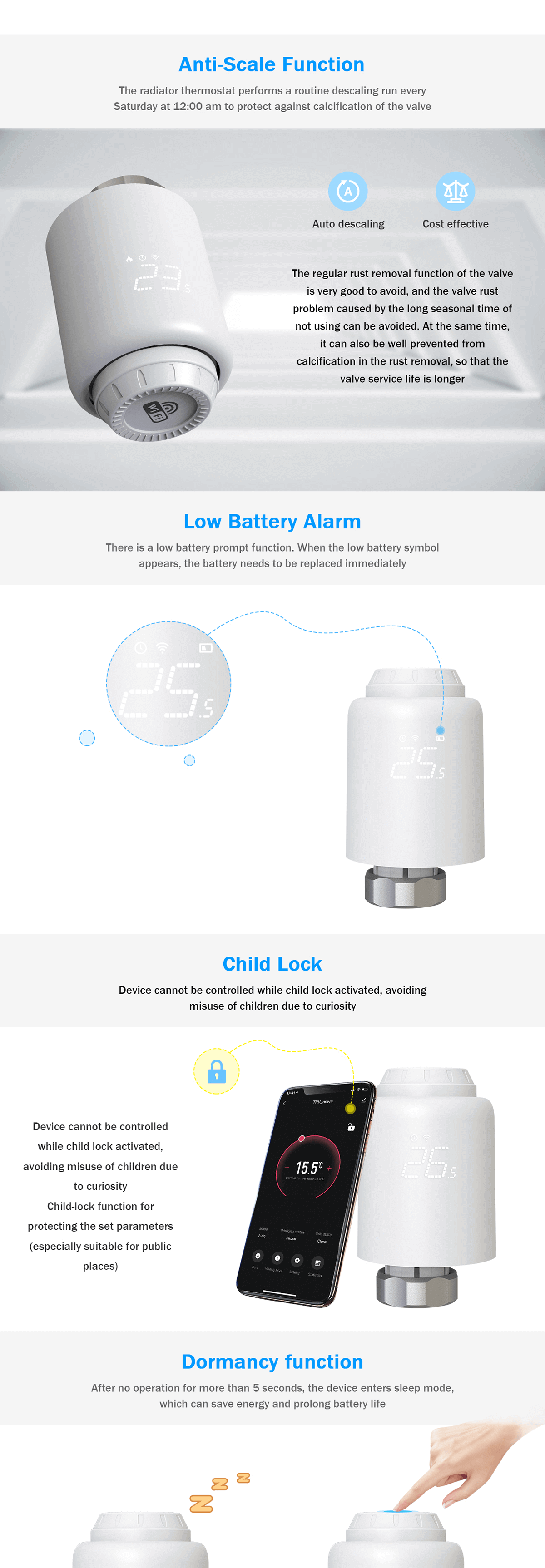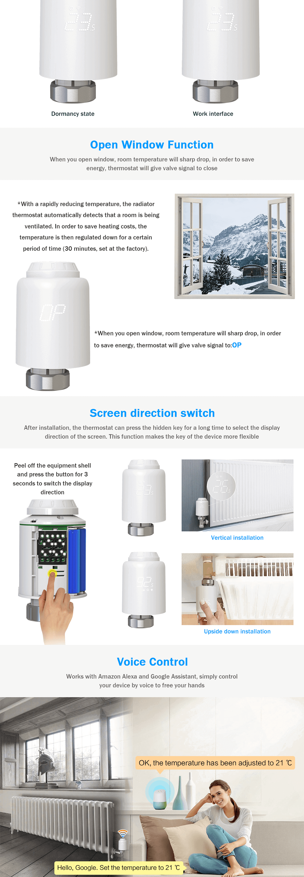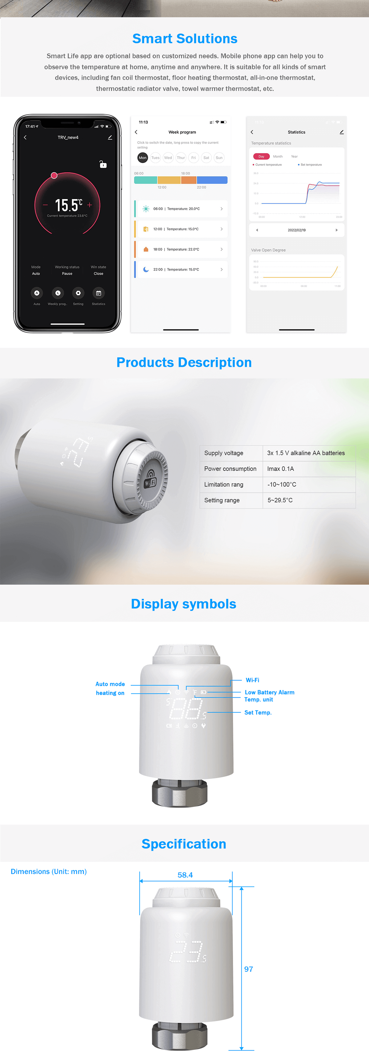 1) Automatic debugging function, suitable for all kinds of mainstream valves 2) The device supports Wi-Fi fast distribution network, no additional gatewayis required 3) The motor adopts ultra-quiet technology to minimize noise pollution 4) The device has activated the automatic conversion of summer time and wintertime, which can be activated or terminated as needed 5) lntelligent PID algorithm, efficient control of valve opening and closing,energy saving and environmental protection