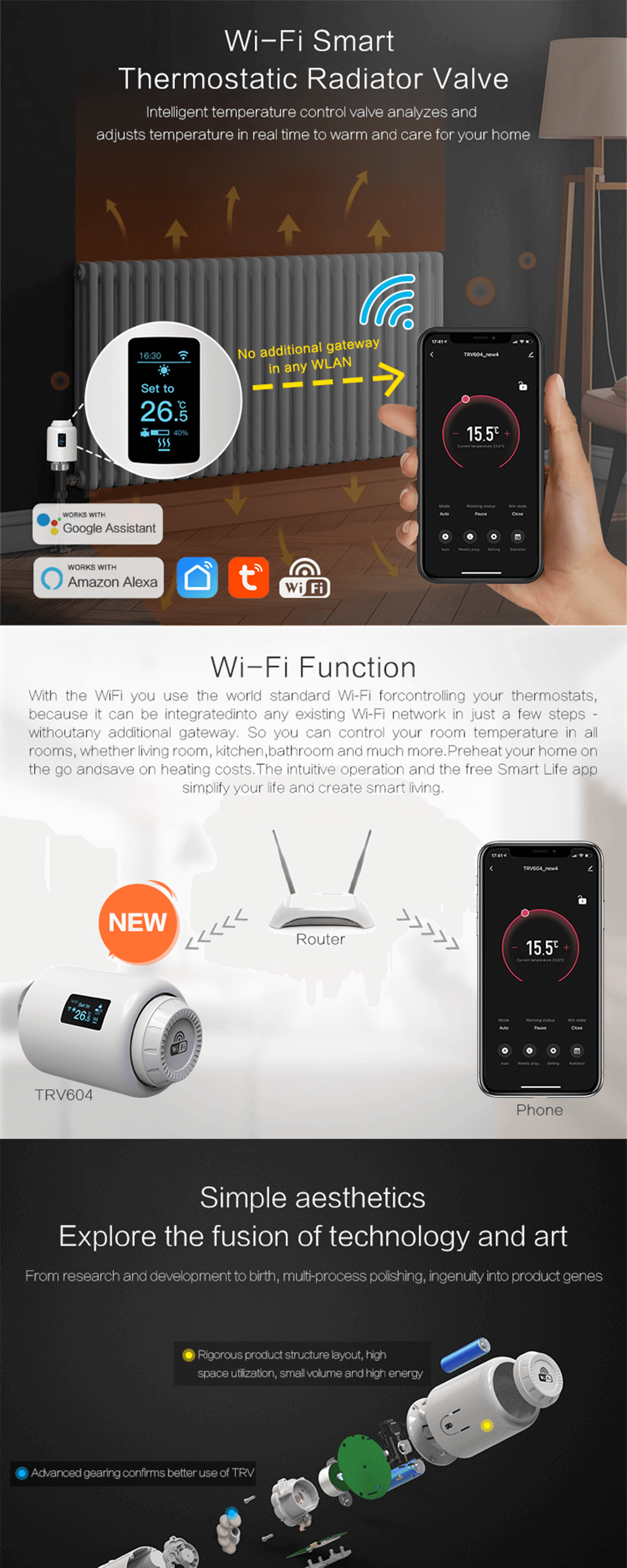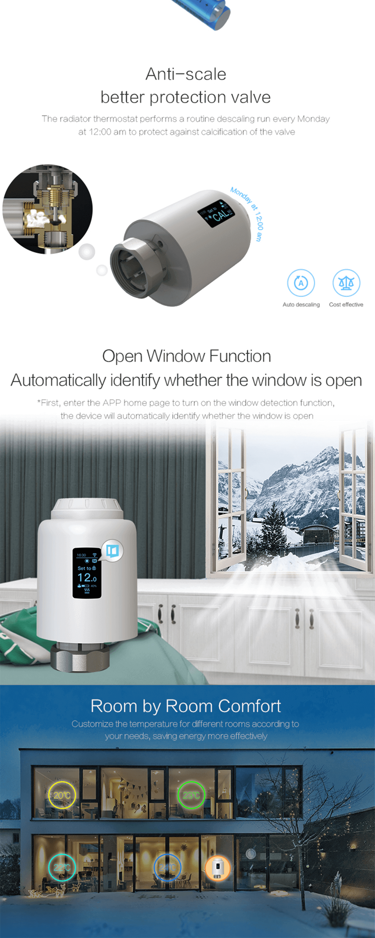 1) Automatic debugging function, suitable for all kinds of mainstream valves 2) The device supports Wi-Fi fast distribution network, no additional gatewayis required 3) The motor adopts ultra-quiet technology to minimize noise pollution 4) The device has activated the automatic conversion of summer time and wintertime, which can be activated or terminated as needed 5) lntelligent PID algorithm, efficient control of valve opening and closing,energy saving and environmental protection